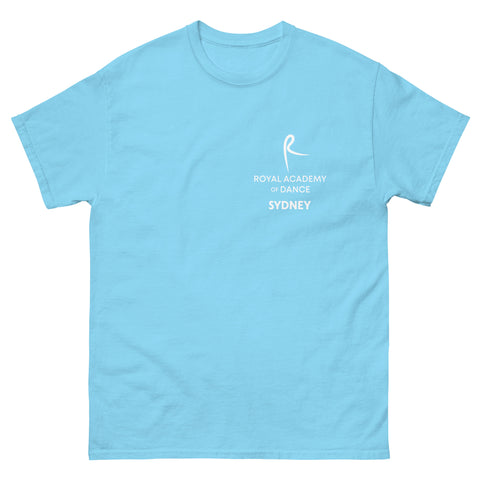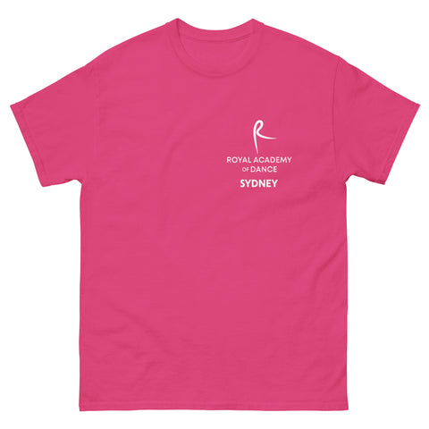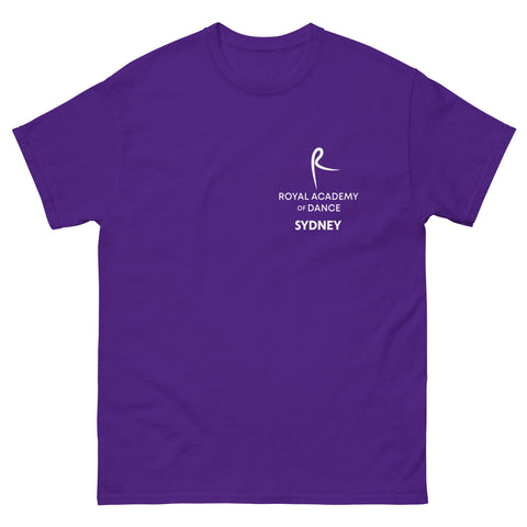 The 100% cotton unisex classic tee printed in white with the R Royal Academy of Dance Sydney will help you land a more structured look. It sits nicely, maintains sharp lines around the edges, and goes perfectly with layered streetwear outfits.