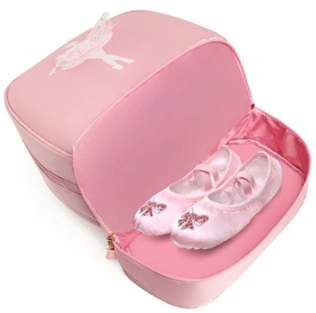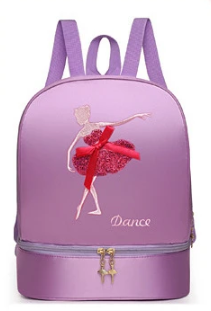 Cute little ballerina backpack for the young dancer, with separate shoe storage, weather proof and easy to wipe clean. Beautiful gold hanging ballerina detail.