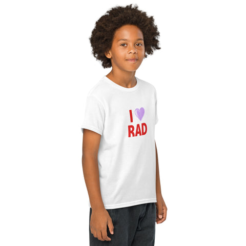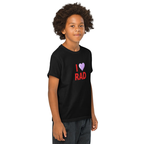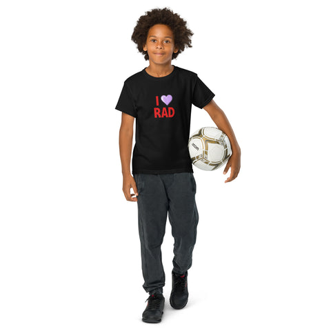 A comfy tee shirt with the I love RAD slogan on the front chest in red with a Pink Heart for Kids.
